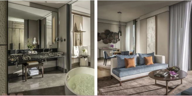 曼谷凱賓斯基酒店內部具有300多間客房,每間客房都極為寬敞,整體裝修色調優雅,不論是墻面、地毯、臺盆或是燈具,將泰式風格與日常材料交織一起促使復古與現在的無縫融合,整體設計在豪華中不失穩重和溫馨。