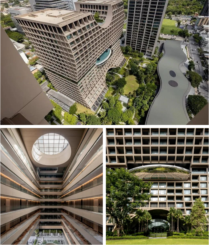 大堂的設計非常前衛,仿佛是把度假酒店的開放式大堂搬進了美術館:混凝土弧形穹頂很好的保留了大自然韻味,酒店大堂呈隧道樣式延伸,增強與周圍綠色區域還有玻璃窗戶結合,將暹羅老建筑風格與潮流派的融匯,狠狠拿捏曼谷極其crossover的城市風格