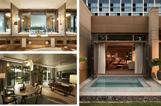 建筑、庭院、露臺和水榭打破了室內與室外的空間感,讓住客盡情享受城中度假的自在氛圍。步入酒店,精致的庭院配備植物,直接將幾何排布的水上步道串聯在一起,形成獨特的自然景觀。