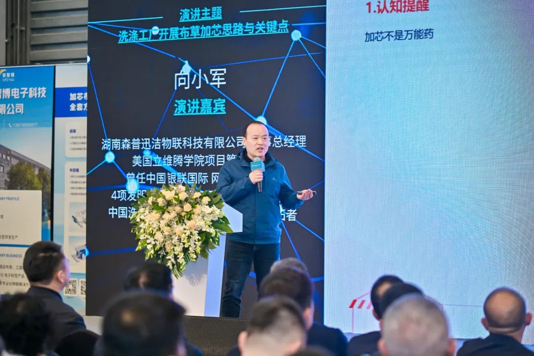 湖南森普迅潔物聯科技有限公司董事總經理向小軍先生,介紹了森普迅潔的高效快速布草加芯方案,涵蓋了系統軟硬件以及為洗滌廠經營共享布草提供的金融幫扶計劃。其硬件產品如智能工作臺、手持機、便攜式 RFID 掃描器和超高頻 RFID 芯片等,具備高效的數據采集和處理能力;軟件系統則能實現對布草位置的精準標記和監控。金融幫扶計劃更是為洗滌廠提供了資金支持,助力其更好地開展布草加芯業務。